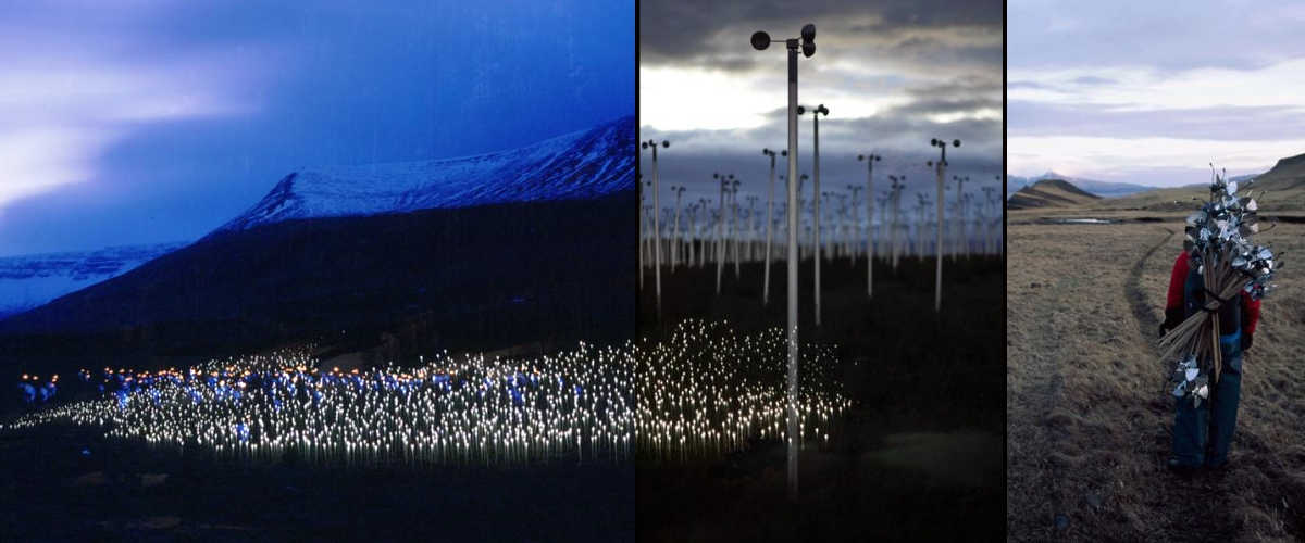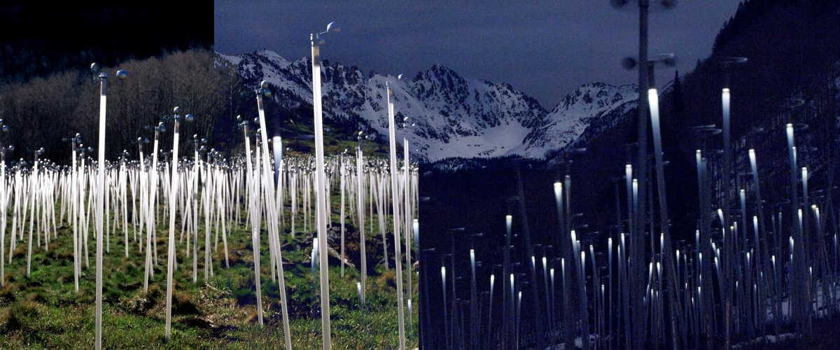 Sculptor Patrick Marolds windmill project consists of numerous polycarbonate tubes, LEDs and mini wind turbines. Planted in breezy landscapes the mini wind generators render the behavior of wind into the living body of light. Subtle during the daylight, the project comes alive at night and transforms wind power into a visual choreography. Its beauty draws attention to the use of clean renewable energy and our interaction with the landscape and natural forces.